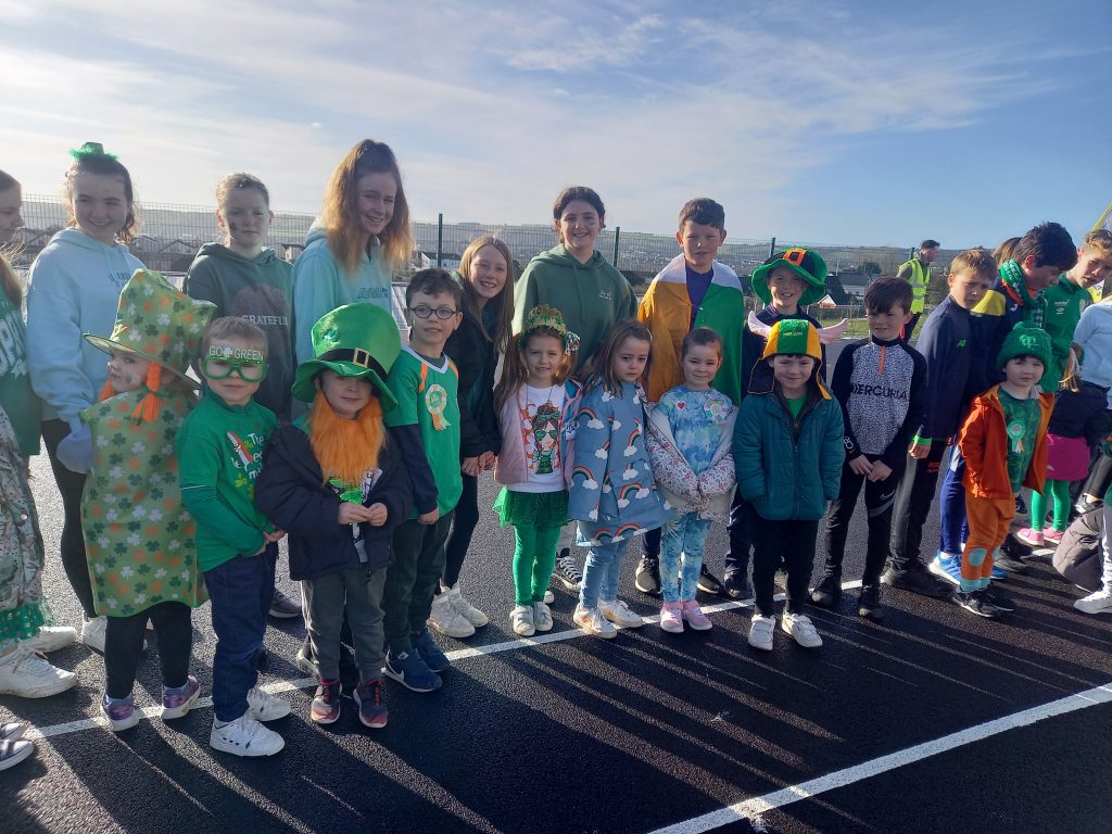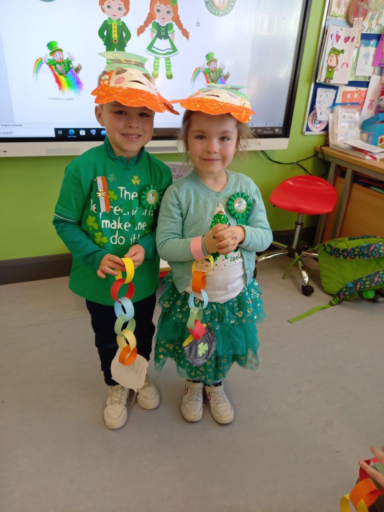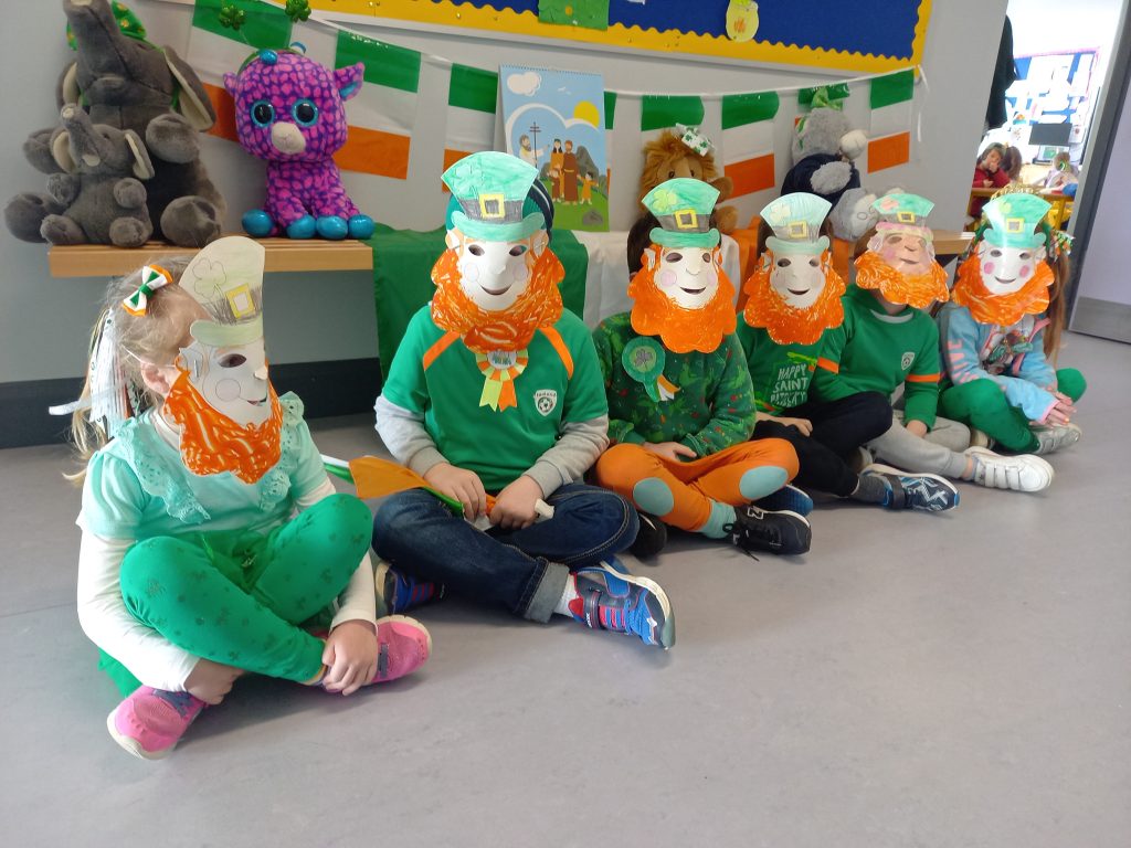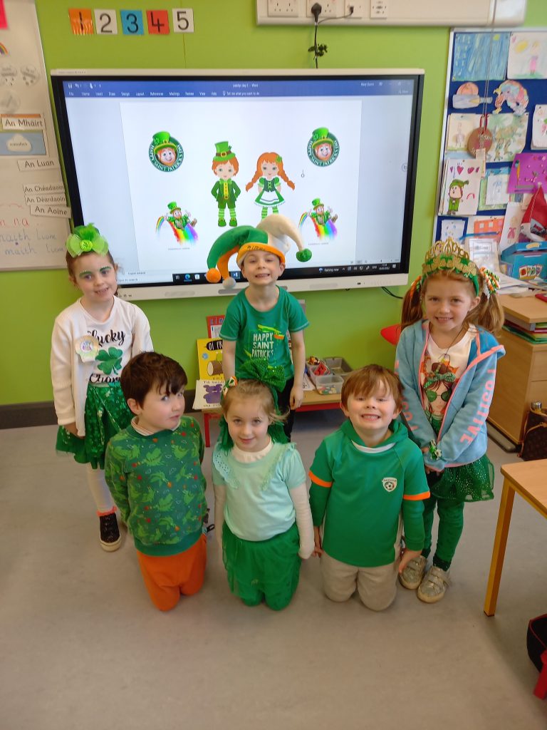 Lá ‘le Pádraig, Lá ‘le Pádraig, Lá ‘le Pádraig hip hurá! Bhí an-lá againn ag ullmhú do Lá ‘le Pádraig. Sheinn an píobaire dúinn agus bhí paráid iontach againn timpeall na scoile. Bhí gach uile duine sa scoile gléasta suas is bhí atmaisféar álainn sa Ghaelscoil.