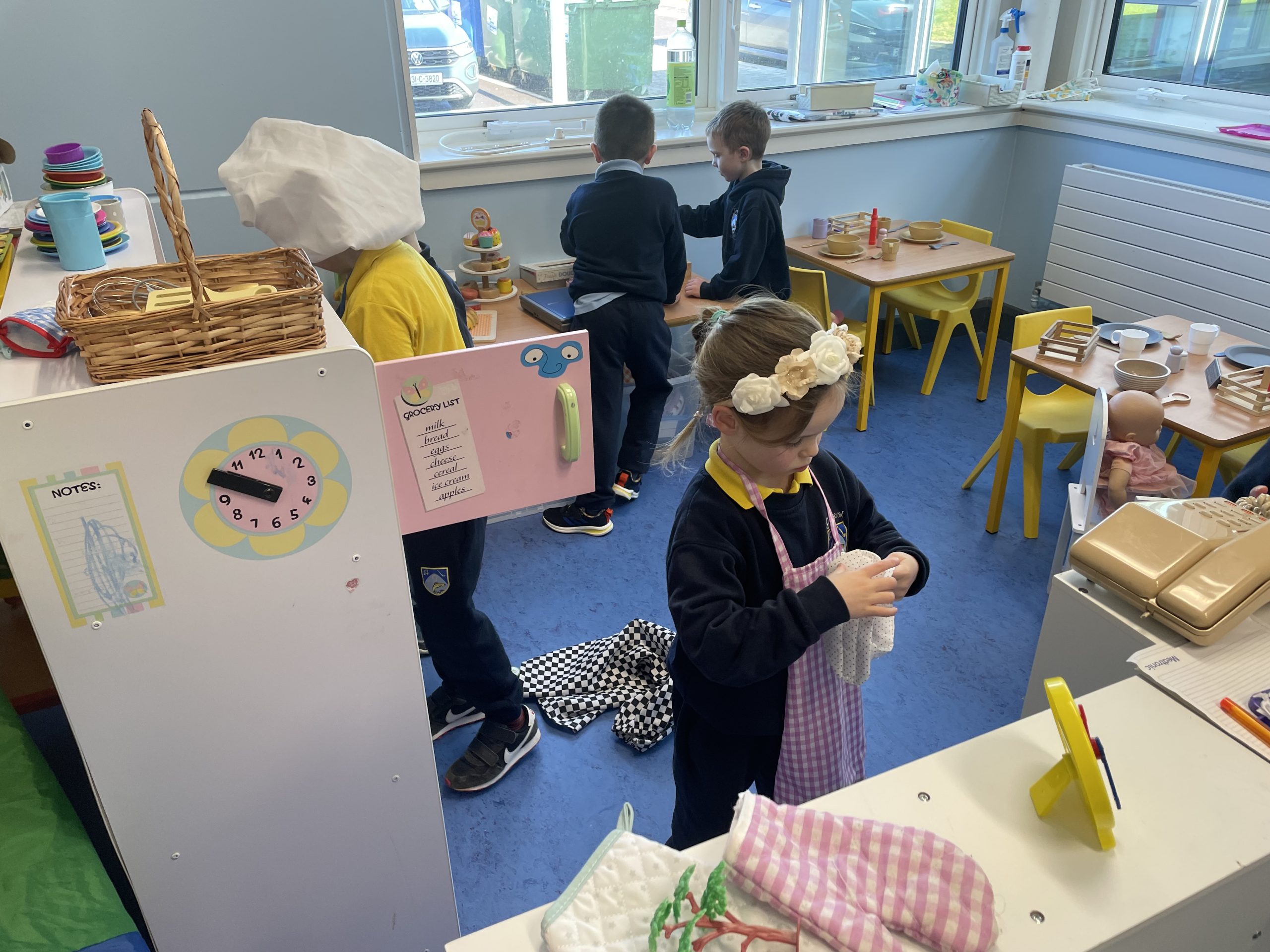 Thosaidh ár naíonáin ar an gclár Aistear le déanaí agus is breá leo é. Tá seomra álainn ‘Aistear’ againn agus tugann sé deis do na páistí cleachtadh an tsaoil a fháil is iad ag súgradh lena chéile. Is féidir leo ról-imirt a dhéanamh ar thuras chuig an dochtúir, ag dul go dtí an siopa, lá ar an bhfeirm, ag ithe sa bhialann srl. Is áis iontach é agus tá na páistí go léir ag baint sár-thaitnimh as. Maith sibh naíonáin bheaga.